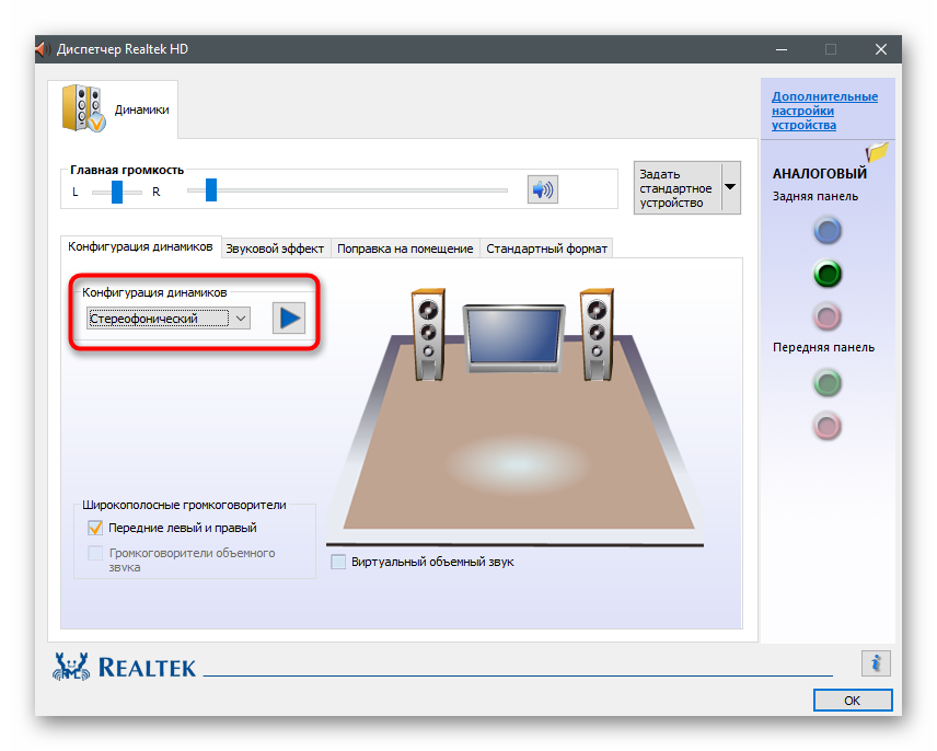 - В программе на вкладке «Динамики» установите конфигурацию динамиков «Стереофонический» и нажмите кнопку воспроизведения для запуска теста.