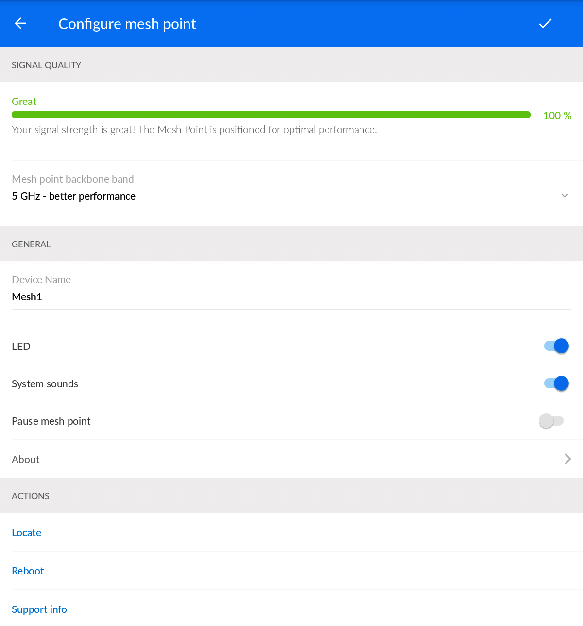 Первоначальное подключение рекомендуется выполнять недалеко от базового роутера. По умолчанию, репитер использует в качестве «несущей» сеть 5 ГГц. Если репитер находится достаточно далеко от роутера или за несколькими стенами, можно переключить его на использование более «дальнобойного» диапазона 2,4 ГГц. Другие настройки позволяют включить или отключить звуковые эффекты и световые индикаторы, временно отключить репитер, подать звуковой сигнал для поиска устройства, выполнить перезагрузку. Детальная информация о репитере позволяет узнать информацию о прошивке и MAC адреса всех беспроводных интерфейсов.