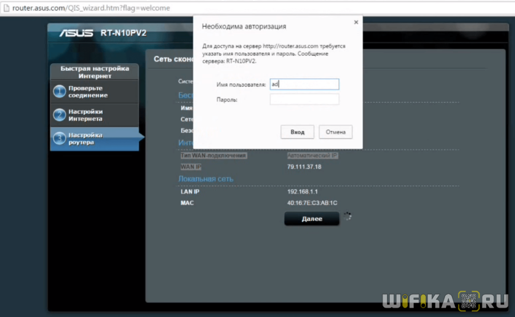 После чего переходим к настройкам на роутере. Заходим в панель управления Asus по адресу 192.168.1.1 через обычный браузер