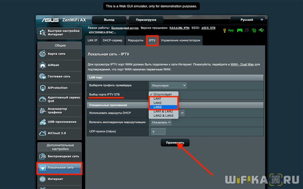 В новой панели администратора черного цвета, которая установлена в современные маршрутизаторы Asus, нужно найти раздел «Локальная сеть» и переключиться на вкладку «IPTV». И аналогично выбрать в меню «Профиль провайдера» свой сетевой разъем.