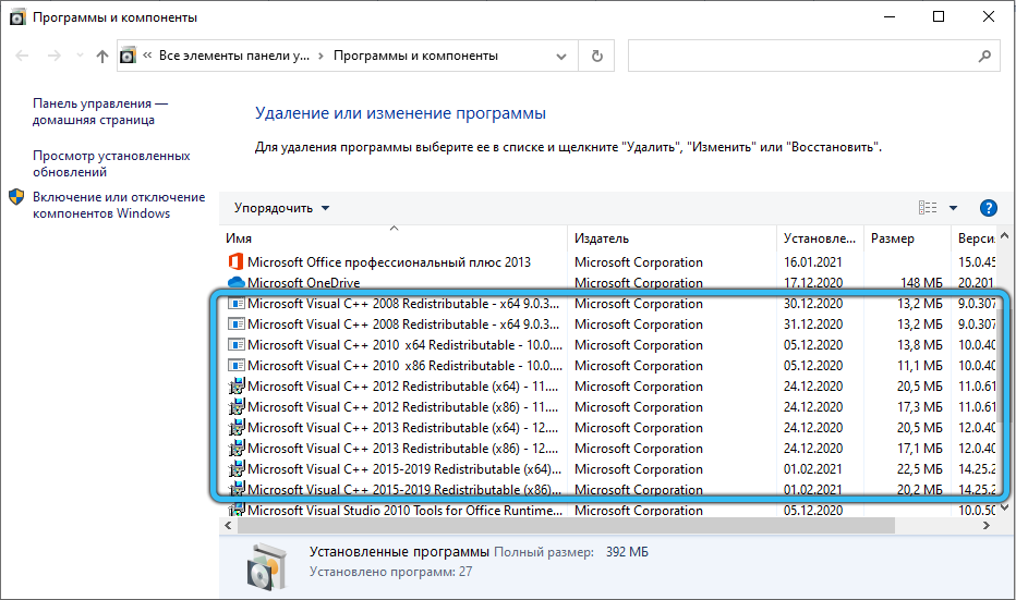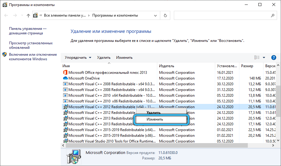 Убедитесь, что в системе присутствуют версии обеих разрядностей, 32- и 64-битные. Выделите пакет Visual C++ Redistributable мышкой, после чего кликните по кнопке «Изменить» в верхней панели. В новом окошке необходимо нажать кнопку Repair, после чего система попытается восстановить пакет, устранив при этом ошибки установщика.