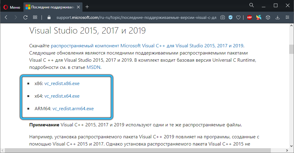 Когда в списке установленный пакет файлов Visual C++ Redistributable конкретной разрядности отсутствует, необходимо его скачать с официального сайта и инсталлировать. Конкретный год пакета С++ имеется возможность определить непосредственно по имени фигурирующего в сообщении файла, скачивать нужно только компоненты, соответствующие этому году, причём устанавливать нужно и 32-битную (x86) версию – в некоторых случаях 64-разрядная Windows 10 использует 32-битные библиотеки С++. Так, довольно востребованная игровая платформа Origin, пользующаяся популярностью у геймеров, часто ссылается на обе библиотеки, и если пакет меньшей разрядности отсутствует, появится ошибка с кодом 0xc0000020.