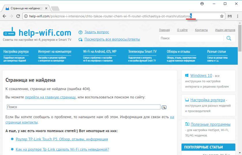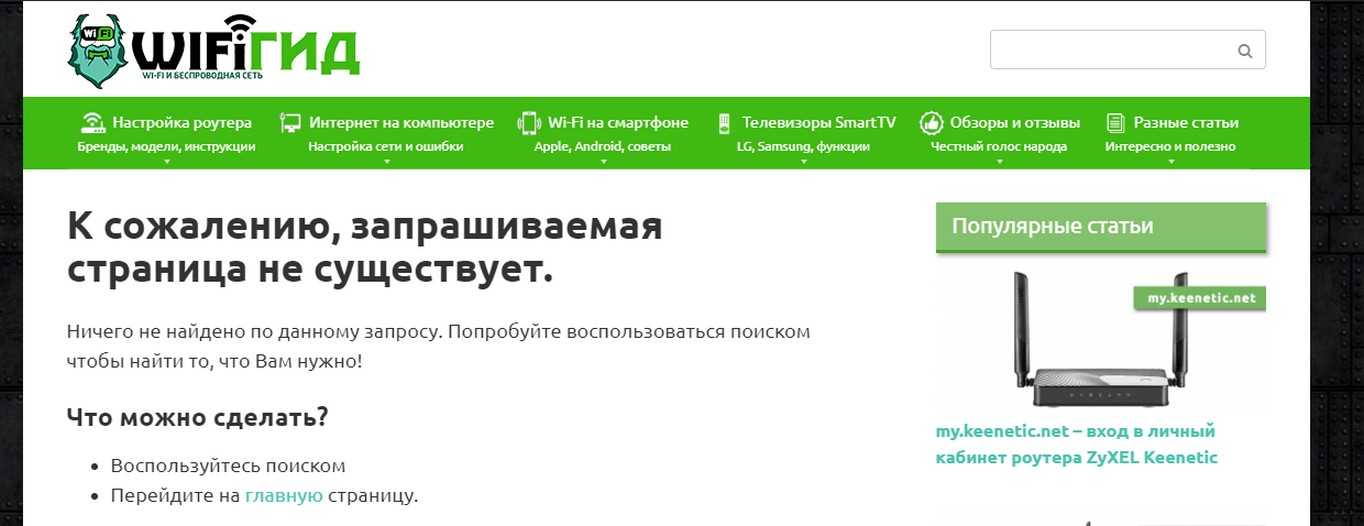 Данная ошибка означает, что вы пытаетесь перейти по адресу, которого не существует. Страница по этому адресу недоступна. Адрес страницы изменился, или она была удалена. Например, возьмем одну из страниц этого сайта. Пускай это будет https://help-wifi.com/poleznoe-i-interesnoe/chto-takoe-router-chem-wi-fi-router-otlichaetsya-ot-marshrutizatora. Если перейти по этому адресу, то загрузится необходимая нам страница. Но, если изменить адрес, например добавить в конце какую-то цифру, или букву, то мы увидим ошибку “Страница не найдена”. Так как страницы с таким адресом просто не существует на сайте.