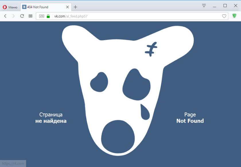 В социальной сети Вконтакте, например, страница с ошибкой 404 выглядит вот так (Page Not Found):