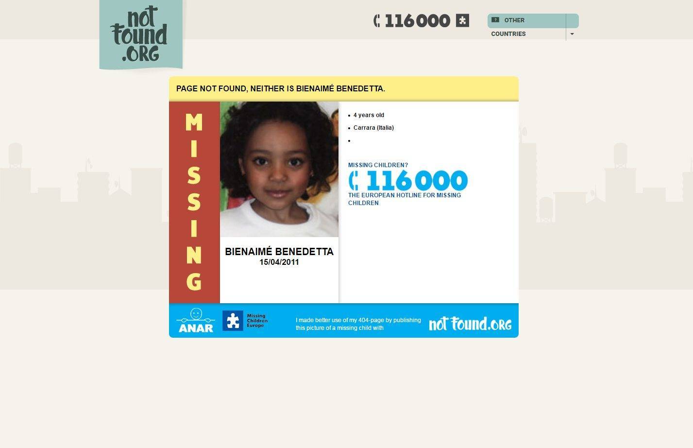 А еще Страницы 404 могут выполнять и совсем необычную общественно-полезную роль. Например, сайт NotFound.org устанавливает на ваши странички 404 информацию о потерянных детях.