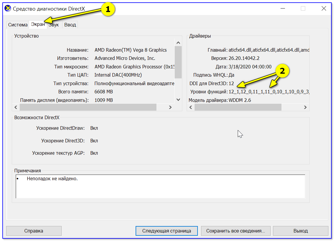 Для начала на всякий случай проверьте версию DirectX на вашем компьютере и версию WDDM, для этого нажмите клавиши Win+R на клавиатуре (Win — клавиша с эмблемой Windows), введите dxdiag и нажмите Enter, согласитесь на проверку цифровых подписей и дождитесь окончания сбора информации
