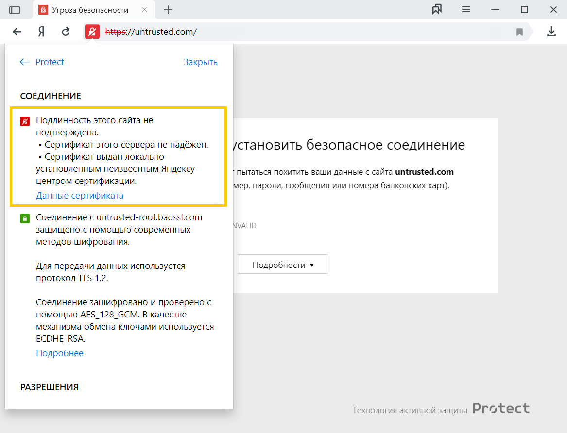 В этом случае сертификат может быть установлен либо администратором сети, либо неизвестным лицом. Вы увидите следующее предупреждение: