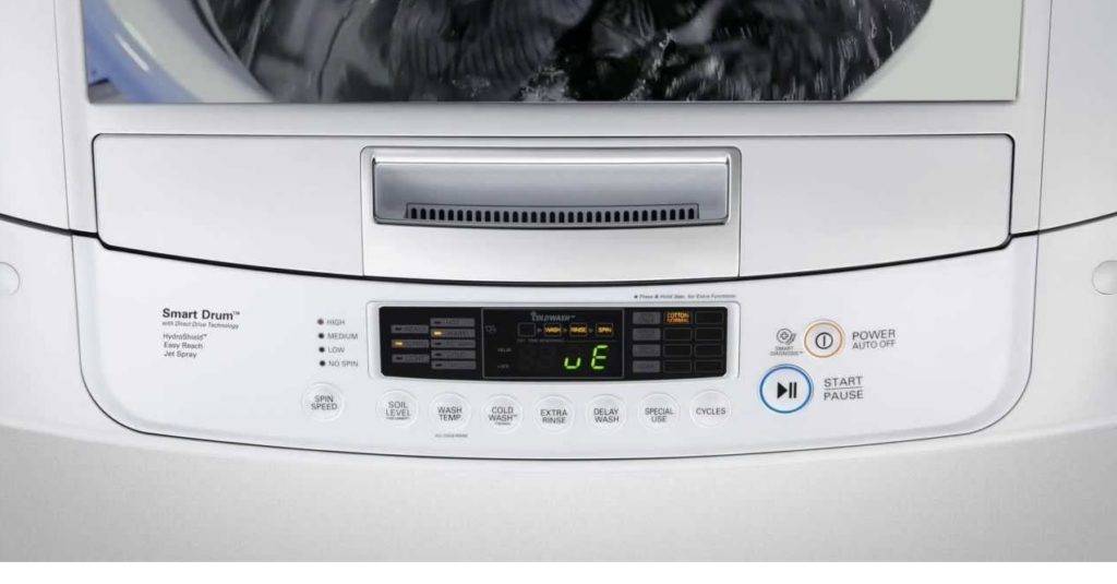 Если вы стираете пару футболок при максимальной загрузке барабана 5-6 кг, вероятнее всего, в процессе стирки вы увидите на дисплее на стиральной машине UЕ – ошибку, указывающую на дисбаланс. Догрузите достаточное количество вещей и снова запустите агрегат – код должен исчезнуть.