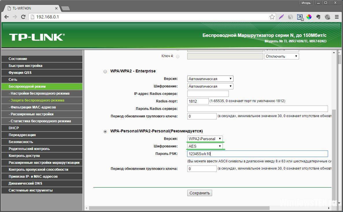 Для совместимых по стандартам приемника и передатчика выбирают WPA2-PSK с шифром AES. На устаревших версиях придется выбрать шифр TKIP.