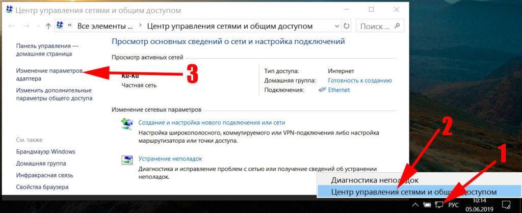 Войдите в «Центр управления сетями…..», «Изменения параметров».