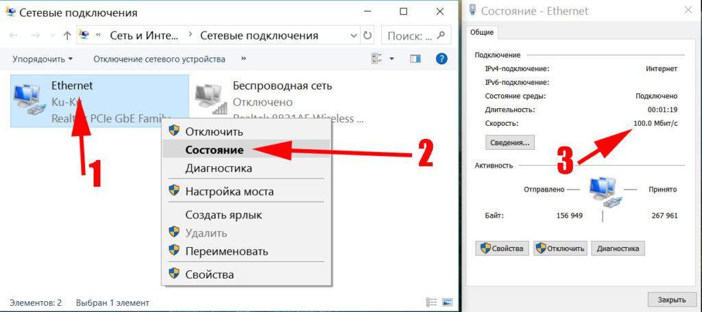 Нажмите ПКМ на значке «Ethernet» и выберите «Состояние». Напротив строки «Скорость» будет написана скорость соединения между устройствами.