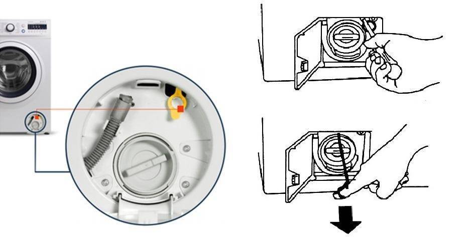 Во многих моделях стиральных машин на передней панели там, где находится сливной фильтр, имеется специальный трос, потянув за который произойдет аварийное открытие дверей. Чаще всего такой трос имеет оранжевый цвет.
