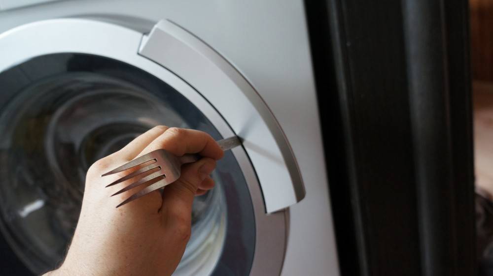 Этот способ подойдет, когда в ходе стирки от загрузочного люка отваливается/отрывается ручка. Если на дверце стиралки после этого останется хотя бы небольшой фрагмент оторванной/отвалившейся детали, то можно взять в руки плоскогубцы, пинцет или зажим, чтобы аккуратно потянуть за осколок и разблокировать замок.