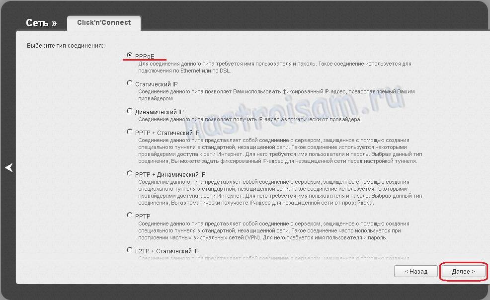 В начале Вас попросят подключить WAN-кабель (это кабель провайдера, приходящий в Вашу квартиру). Это нужно для проверки соединения после настройки. Вообще, это не обязательно, но желательно. Нажимаем кнопку Далее. Попадаем в раздел выбора типа соединения: