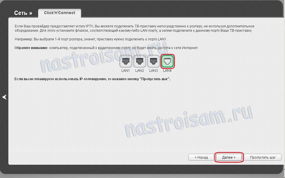 Выбираем порт для STB-приставки и нажимаем Далее.Примечание: Этот вариант настройки IPTV подходит только в том случае, если провайдер для доставки IPTV не использует VLAN. В противном случае — используйте эту инструкцию — ссылка.