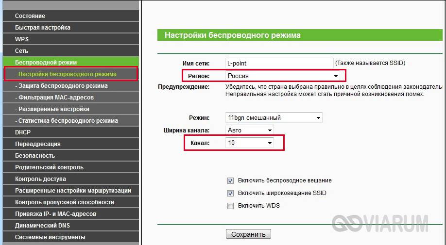 В качестве примера возьмем роутер TP-Link TL-WR841N, инструкцию по настройке которого мы приводили. Заходим в административную панель маршрутизатора, а потом в раздел Беспроводной режим – Настройки беспроводного режима. Здесь в выпадающем списке можно вручную задать один из 13-ти каналов (по умолчанию стоит режим «Авто»). Выберите тот канал, который не используется соседними роутерами и, соответственно, меньше загружен. После изменения настроек сохраните их и перезагрузите устройство.