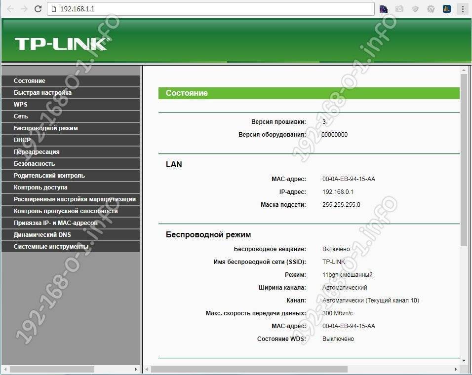 Если вы удачно авторизовались в веб-интерфейса роутера ТП-Линк, тогда откроется страница «Состояние». На ней показывается состояние работы аппарата на данный момент времени: