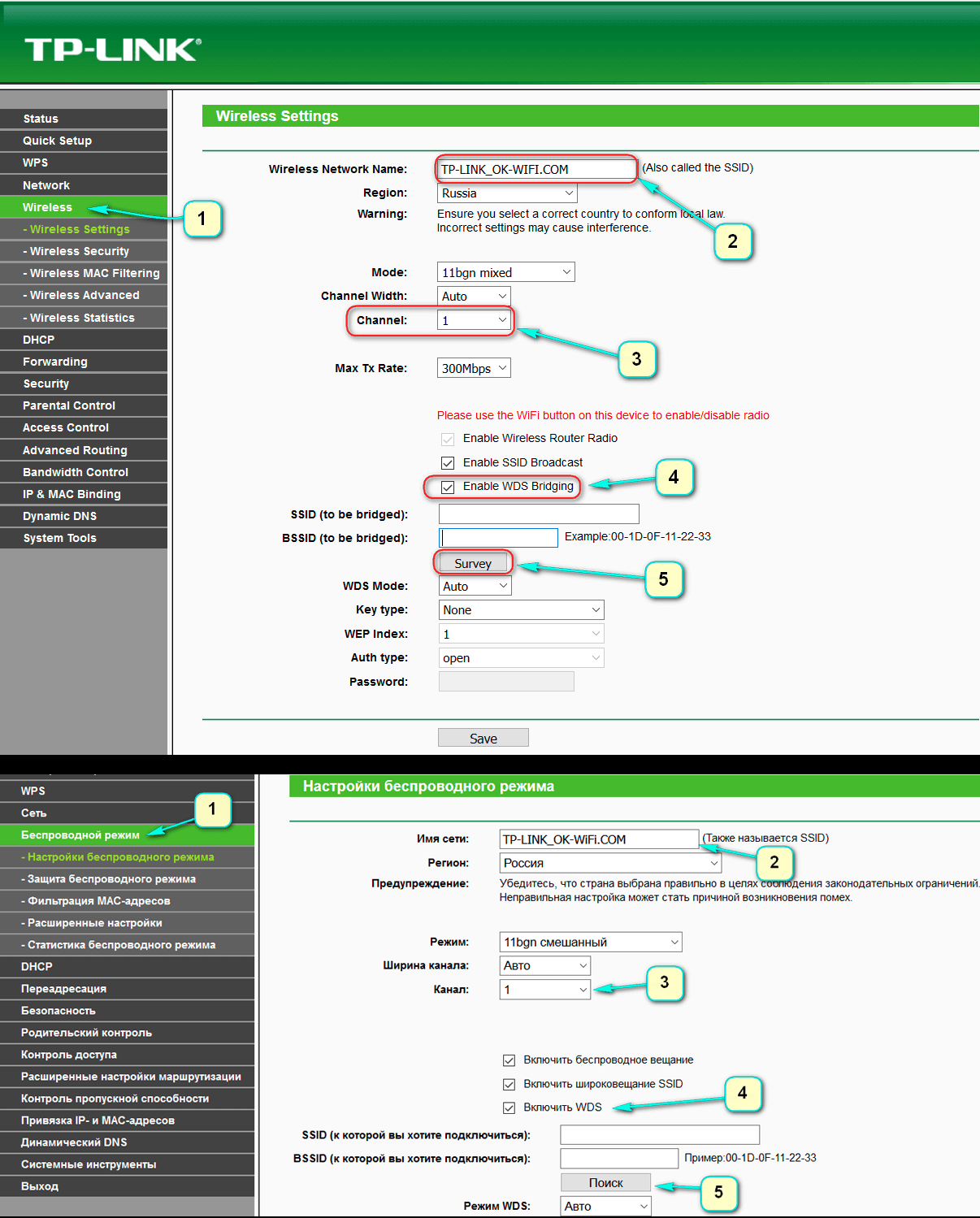 На третьем шаге указывается имя сети. Для этого откройте раздел Wireless. В ней найдите строку Wireless Network Name. В ней напишите имя нового соединения. В строке Channel обязательно укажите такой-же канал, который установили в настройках главного роутера. В примере значение равно 1. Отметьте чекбокс напротив строки Enable WDS Bridging, и кликните Survey.