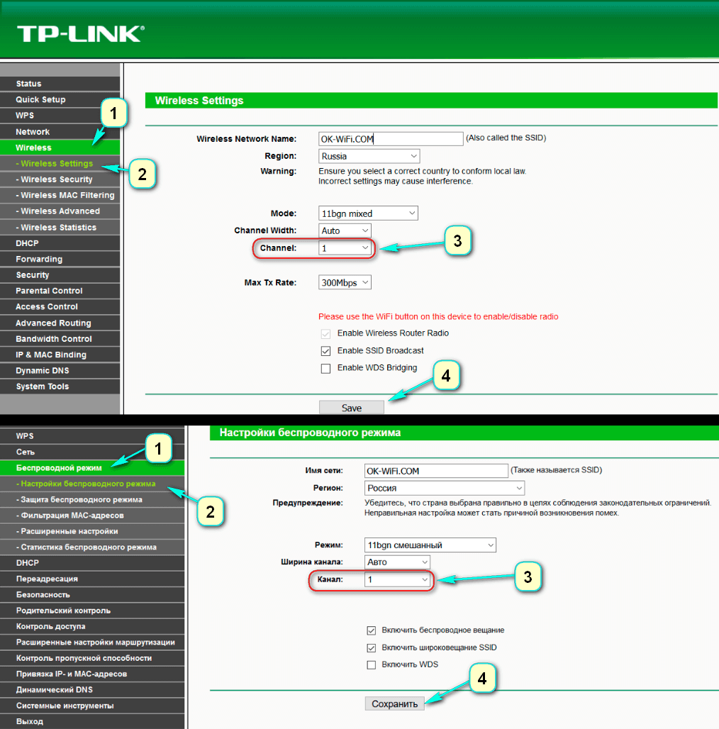 Для Tp-Link делается это просто. Следует авторизоваться в панели администрирования по адресам 192.168.1.1 (192.168.0.1). Если не получается это сделать, прочтите эту статью. Затем перейдите в раздел Wireless, Вас будет интересовать поле Channel. В нем указывается статический канал. Это может быть значение 1 или 6. После этого сохраняются изменения по кнопке Save.