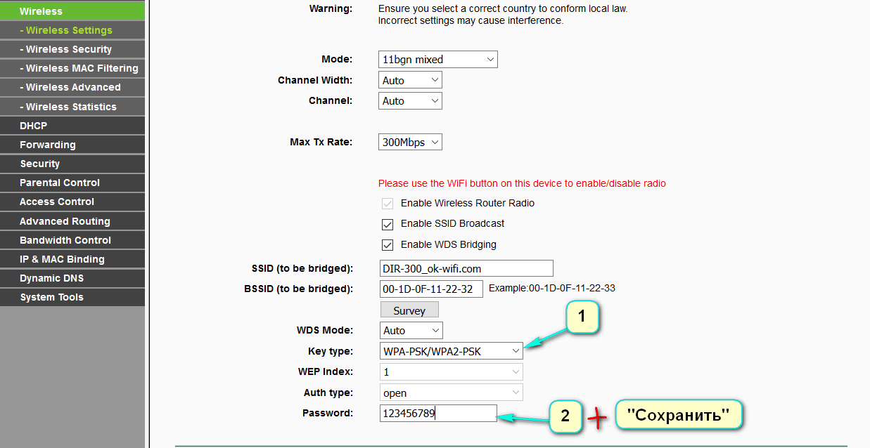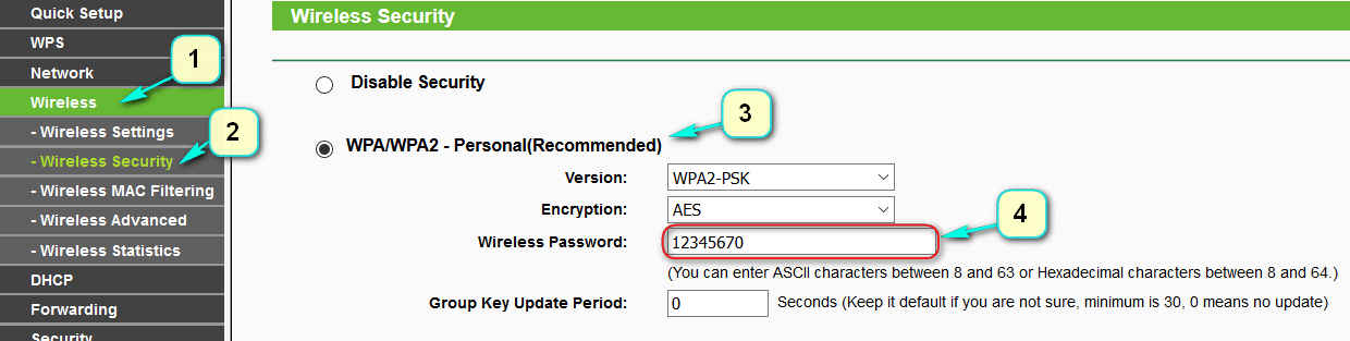 В заключении следует задать сложный пароль на новую беспроводную сеть. Узнать, как это сделать, можно посмотрев инструкцию по защите Wi-Fi на Tp-Link. В параметрах найдите вкладку Wireless — Wireless Security, отметьте раздел WPA/WPA2 — Personal(Recommended), в строке Wireless Password укажите ключи и сохраните по кнопке Save.