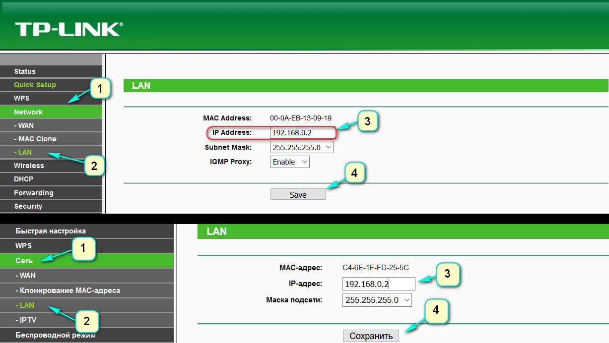 В настройках следует внести изменения в ip-адрес, чтобы не возникло конфликта между устройствами, если они получат одинаковые значения. В такой ситуации они работать не будут. Чтобы изменить данные, откройте раздел Network – LAN. Вас будет интересовать строка IP Address. В ней нужно будет переписать значение последней цифры адреса на 2. После этого примените настройки с помощью кнопки Save и перегрузите устройство.