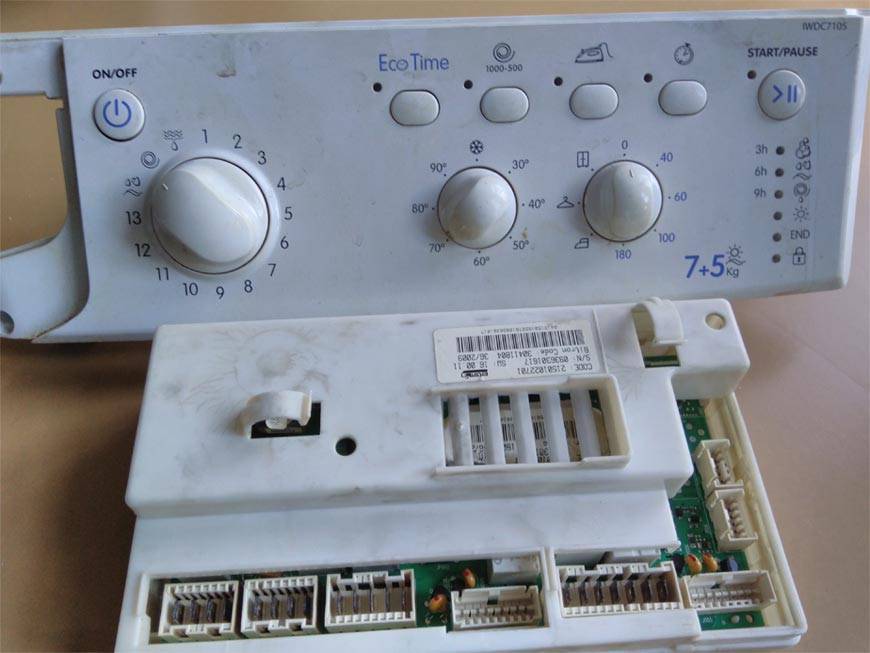 Неисправность платы управления стиральной машины – одна из причин отключения автомата. За время эксплуатации покрытие элементов панели окисляется и прогорает. Кнопка включения может вызвать короткое замыкание из-за износившихся контактов или попадания влаги.