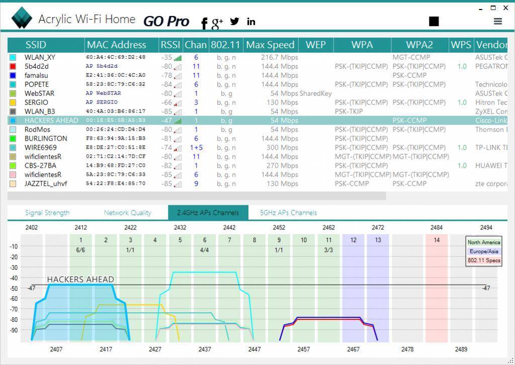 Также не менее популярная Acrylic Wi-Fi. Есть версия бесплатная и платная, в которой добавлены расширенные возможности. Приложение умеет сканировать каналы на всех режимах в диапазоне 2.4 и 5 ГГц, грамотно составляет анализ распределения по каналам.