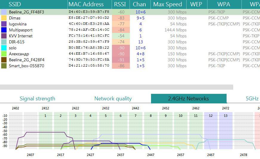 Поэтому в процессе настройки не поленитесь, и скачайте утилиту, которая поможет вам, определиться с выбором канала для вещания. Для примера возьмем программу, которая легкая в пользовании и пользуется популярностью – InSSIDer. Эта утилита умеет хорошо сканировать радиоэфир и выдавать большое количество полезных данных, благодаря которым вы определитесь, какой канал наиболее подходит для вас.