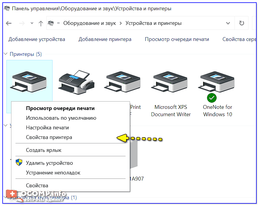 Для ее запуска — нужно открыть панель управления Windows и перейти в раздел “Оборудование и звукУстройства и принтеры” . Далее следует открыть свойства проблемного принтера.