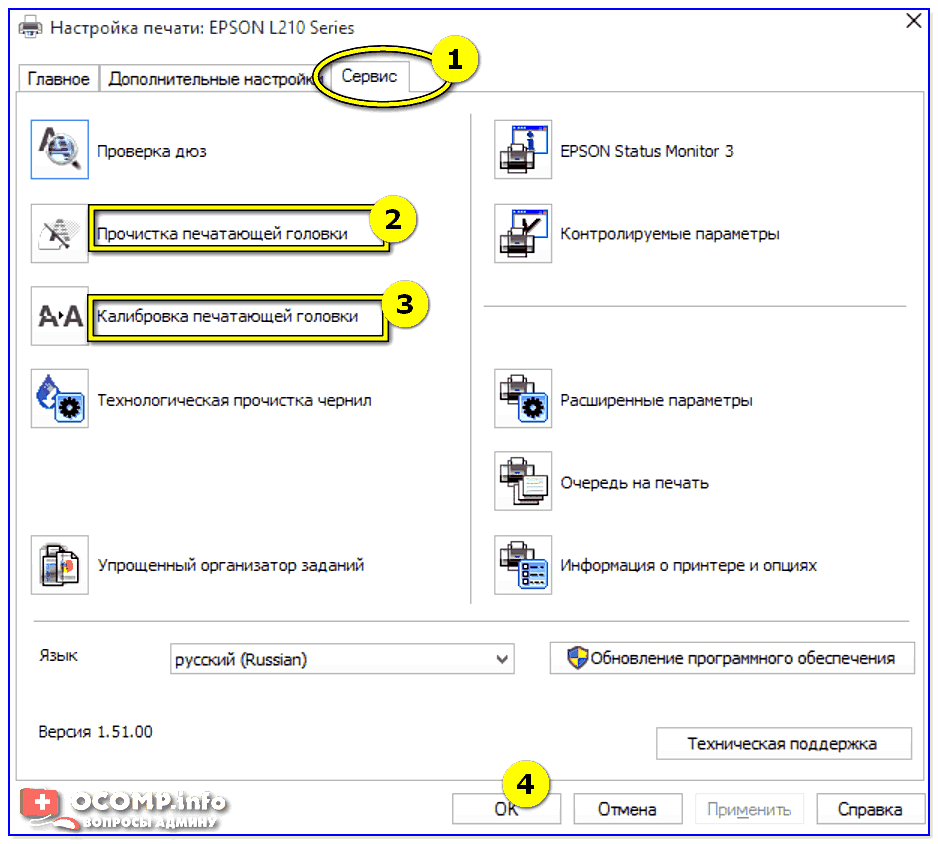 В свойствах многое зависит от модели принтера и его драйвера. В большинстве случаев достаточно открыть вкладку “Сервис” (“Обслуживание”) и выбрать пункт “Прочистка печатающей головки” . Далее принтер немного “прожужжит” и качество печати станет заметно лучше.