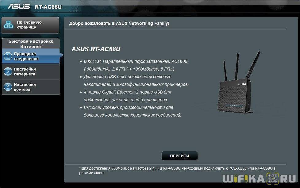 Теперь переходим в основной раздел админки роутера — кстати, именно сюда бы мы попали сразу, если бы подключили модем к уже ранее настроенному роутеру Асус