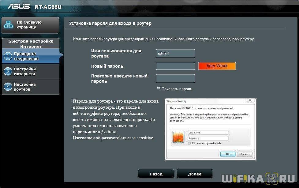 На первом шаге нас попросят поменять пароль для доступа в панель управления устройства — задаем более надежный.