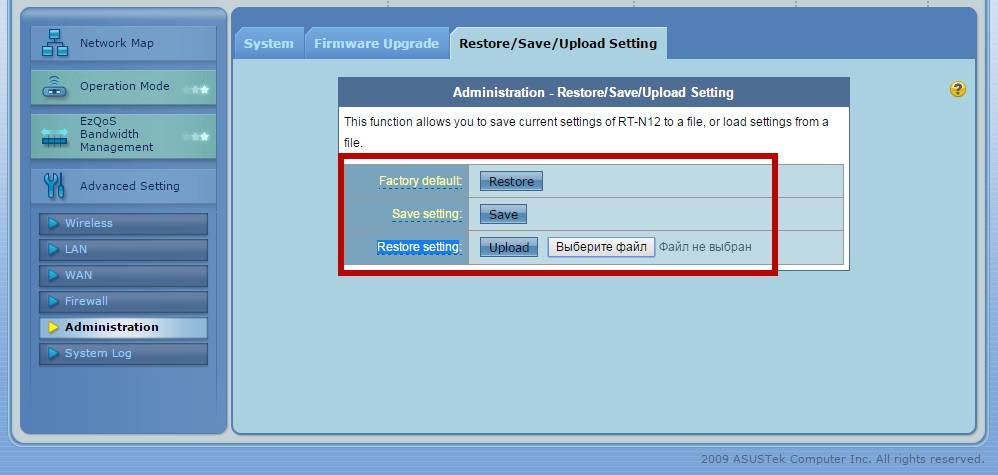 - Для сброса настроек, перейдите по вкладке левого меню Advanced Setting и в появившемся окошке выберите Restore/Save/Upload Setting.