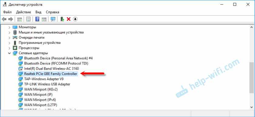В диспетчере устройств открываем вкладку ‘Сетевые адаптеры’. Там должна быть сетевая карта. В зависимости от производителя или драйвера, называться они могут по-разному. Очень часто это что-то типа ‘Realtek PCIe GBE…’.