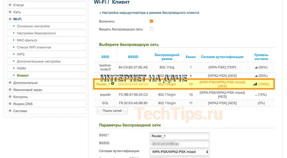 - В основном меню веб-интерфейса находим раздел, посвященный вай-фай подключению. Далее выбираем «Клиент», здесь нужно будет установить галочки в соответствующих полях.