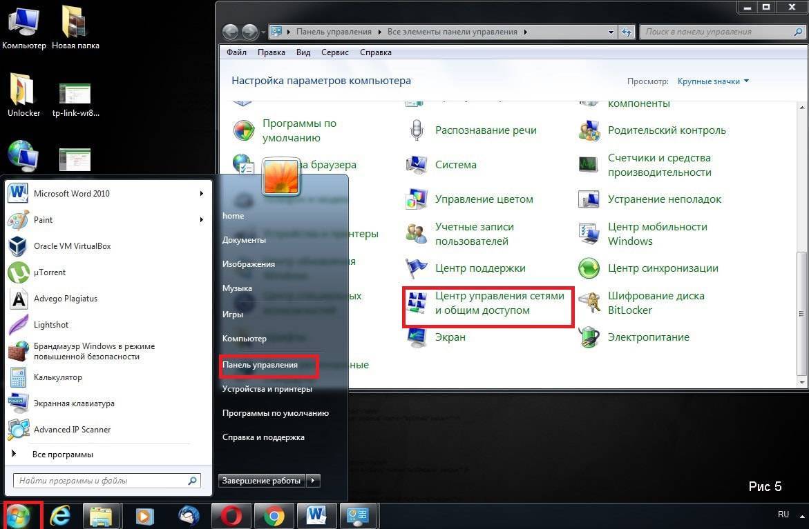 Желательно проверить настройки сети на компьютере — если будет в дальнейшем использоваться LAN подключение к роутеру. Для этого нужно зайти в меню «Пуск» перейти на вкладку «Панель управления» и кликнуть по значку «Центр управления сетями и доступом»