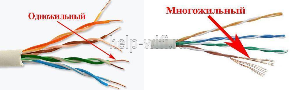 Кабель включает в себя одну жилу (одножильный) или их ряд (многожильный). Первый тип плохо изгибается, но обладает лучшими свойствами, отвечающими за дальность передачи сигнала. Его проще опрессовать, зафиксировать, он практически не гнется. Оптимален для подсоединения интернет-розеток.