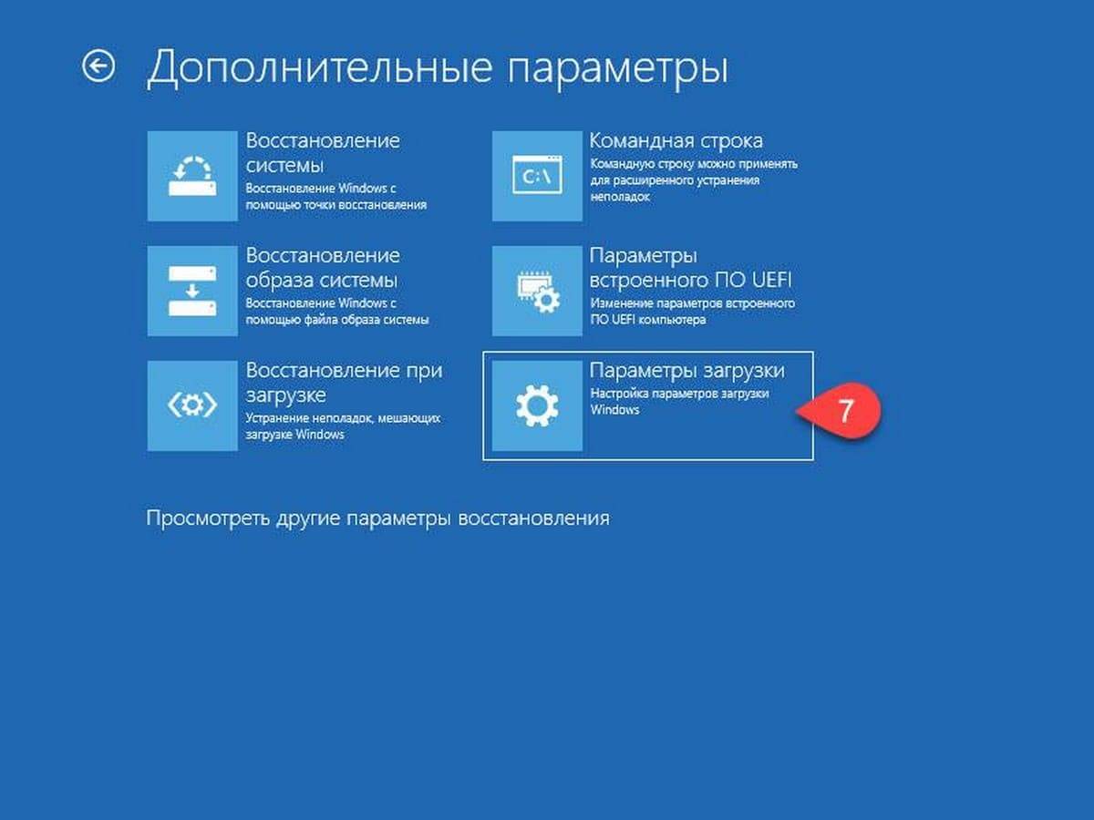 После повторного включения компьютера отобразится среда восстановления, где нужно открыть по очереди вкладки «Диагностика/Дополнительные параметры/Параметры загрузки/Перезагрузить».