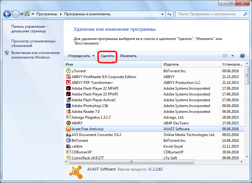 - Находим в списке установленных программ Аваст, выделяем его кликом мышки и жмем в верхней панели «Удалить».