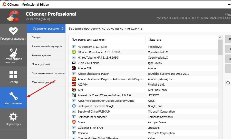 Если представленные ранее варианты деинсталляции вам не понравились, то можно воспользоваться программным обеспечением от сторонних разработчиков. В их качестве выступают CCleaner, Revo Uninstaller и другие подобные утилиты. Принцип действия у всех одинаковый, поэтому можно рассмотреть удаление на примере одного CCleaner:
