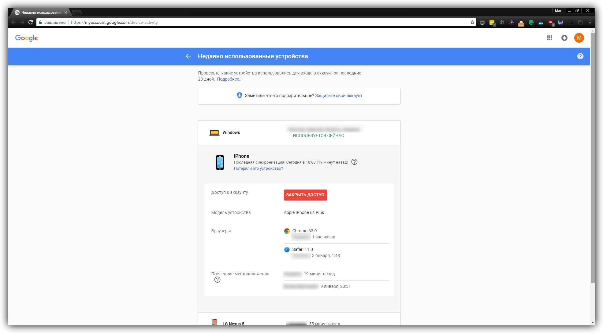 Facebook, «ВКонтакте», Twitter, Gmail и другие сервисы позволяют просматривать активные сессии, открытые на других ваших устройствах, и удалённо разлогинивать их. Например, в настройках Google-аккаунта можно просмотреть все устройства, которые вы недавно использовали, и удалить любое из них. То же самое позволяет сделать