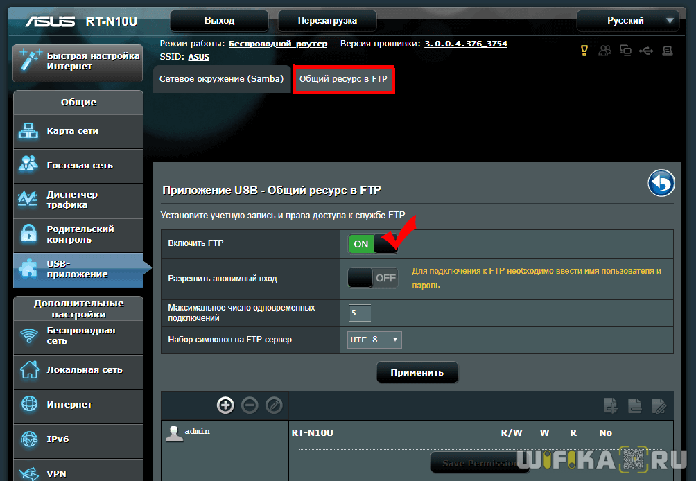 В новой версии панели администратора Asus настройка FTP сервера и прочих функций, выполняемые USB портом, сгруппированы в разделе «USB-приложение».