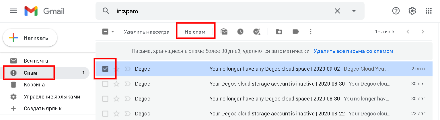 В первую очередь, конечно же, открываем папку “Спам” и на нужные вам письма ставим пометку “Не спам”.