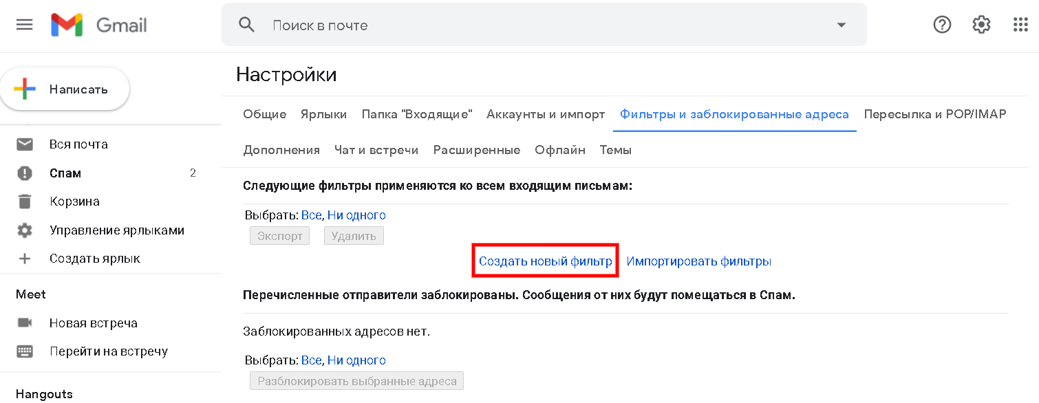 - Откройте вкладку Фильтры и заблокированные адреса.