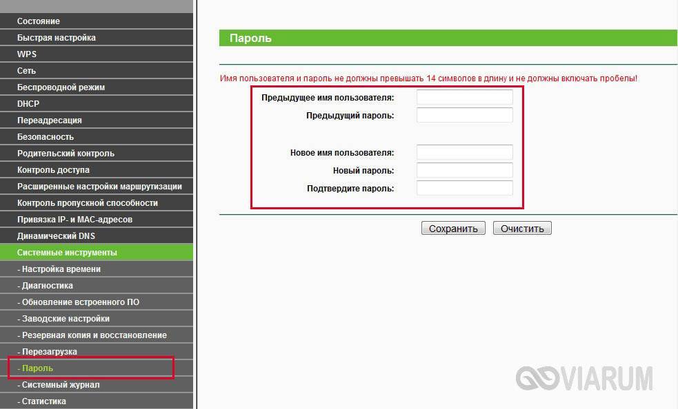 Стандартные имя пользователя и пароль для доступа к административным настройкам делают ваш роутер TP-Link TL-WR841N весьма уязвимым, поэтому лучше сразу же их поменять. Переходим по пути Системные инструменты – Пароль (System Tools – Password). Здесь вписываем старые и новые данные для авторизации (можно поменять только пароль, а имя пользователя оставить admin), а потом нажимаем «Сохранить».