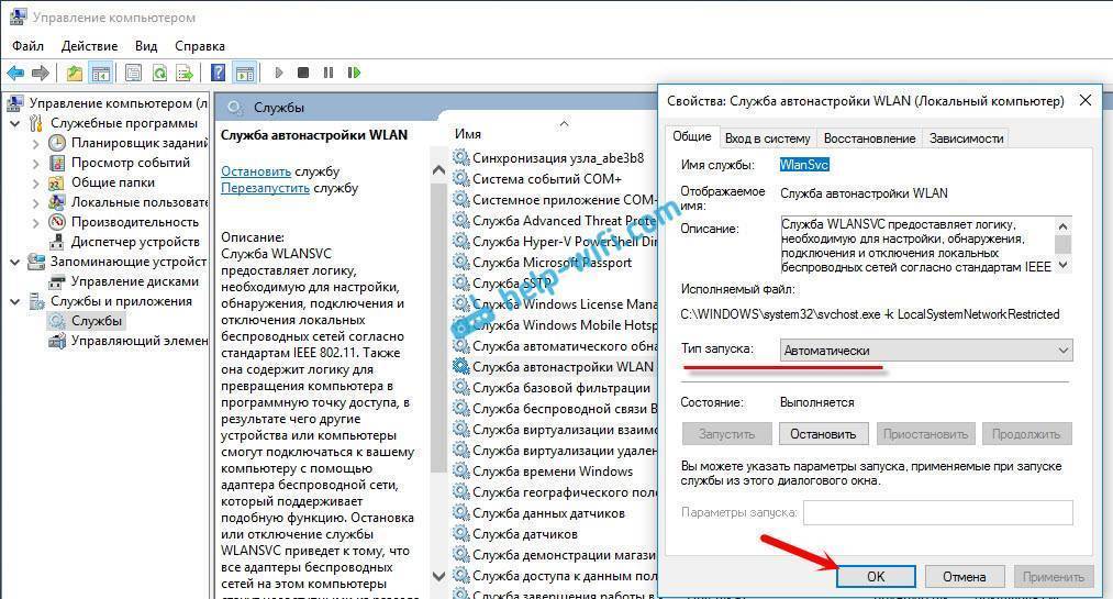 Проверяем, запущена ли “Служба автонастройки WLAN”. Если эта служба на вашем компьютере отключена, то Windows 10 не сможет увидеть Wi-Fi сети. Эту службу иногда отключают разные программы “оптимизаторы” системы.