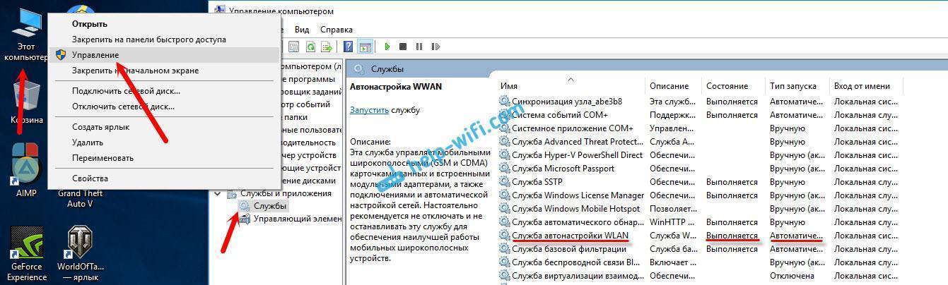Заходим в службы (правой кнопкой на значок “Этот компьютер” и выбираем “Управление”, или через панель управления), переходим в “Службы”, находим “Служба автонастройки WLAN”, и смотрим в каком она статусе. Она должна быть в статусе “Выполняется”, а тип запуска “Автоматически”. Вот так: