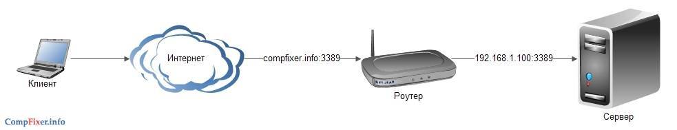 Допустим, есть задача предоставить доступ к удалённому рабочему столу компьютера, который подключён к Интернету через роутер. Для этого нужно создать правило перенаправления любого свободного порта WAN-интерфейса роутера на порт 3389 нужного компьютера. 3389 — это порт, который используется по умолчанию для приёма входящих подключений службы сервера удалённых рабочих столов. После создания такого правила и применения настроек на роутере запросы, поступившие на указанный внешний порт будут перенаправлены на 3389 нужного компьютера в сети.