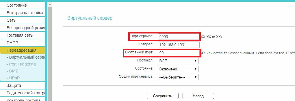 Для внутреннего порта, пожалуйста, введите фактический номер порта (90 в этом примере), затем создайте разные номера служебных портов для двух устройств (например, 9000 и 9001 в этом примере).