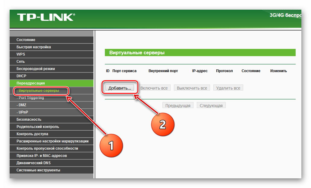 6. Теперь в меню слева выберите раздел «Переадресация», подраздел «Виртуальный сервер». На открывшейся странице нажмите кнопку «Добавить». На открывшейся странице в поле «Порт сервиса» пишем нужный нам порт. В нашем примере – это порт 3389 для удаленного рабочего стола.